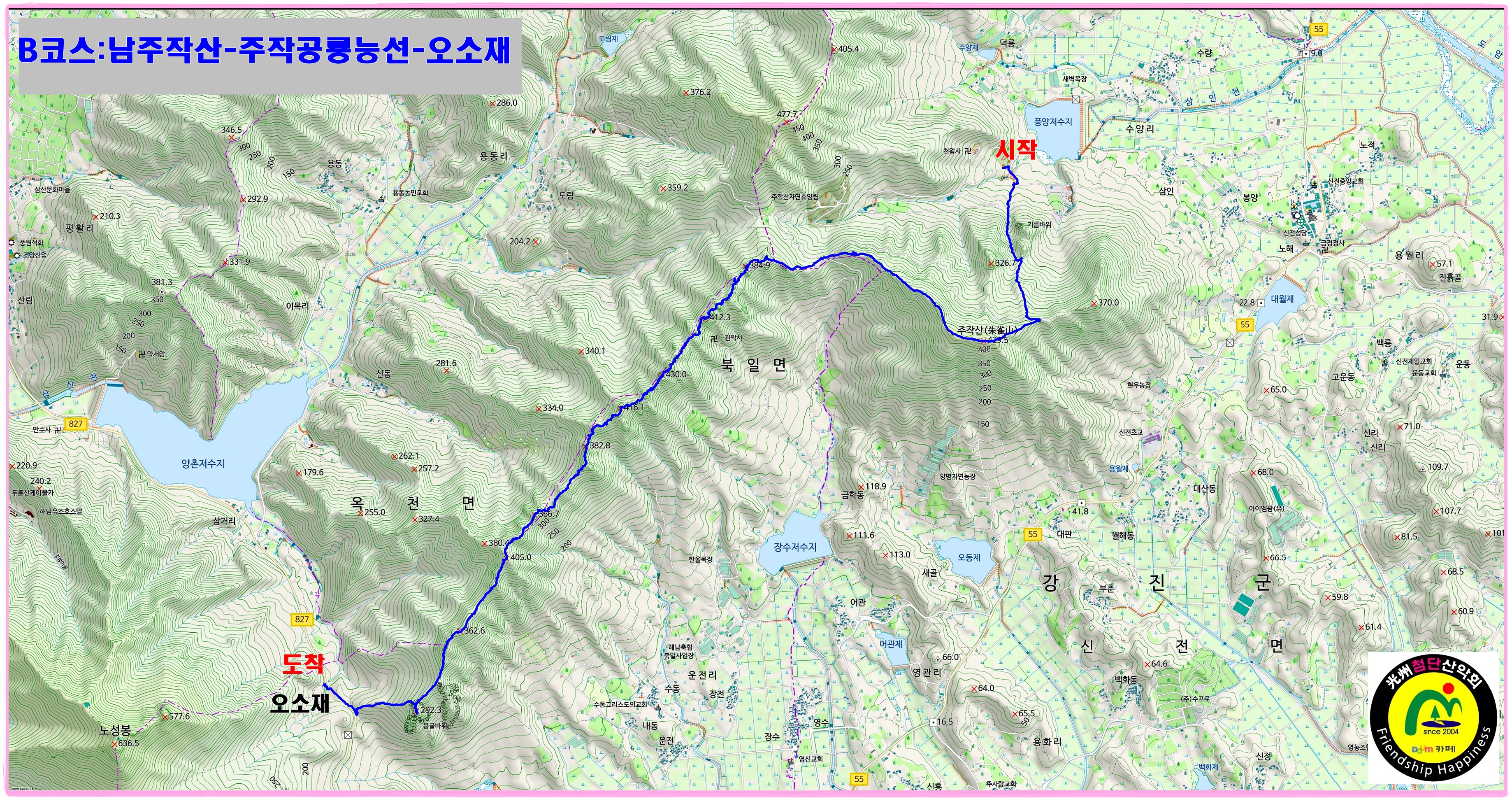 | B코스 | 수양관광농원(들머리)→임도→활공장→남주작산(428m)→전망대→ 주작공룡능선→428봉→412봉→362봉→오소재(날머리,180m) | ||||||