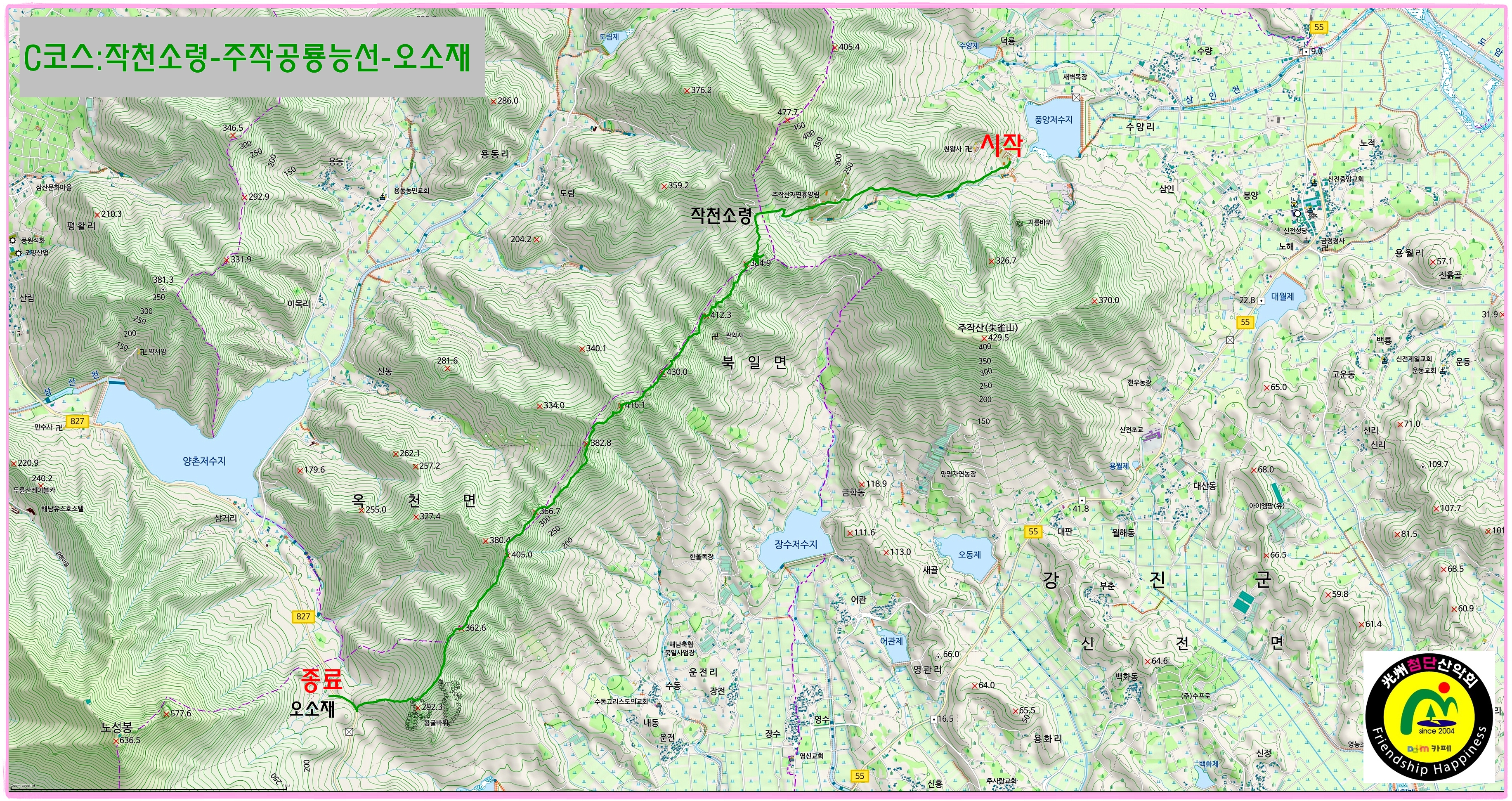 | C코스 | 수양관광농원(들머리)→주작산자연휴양림→작천소령(280m)→ 주작공룡능선→428봉→412봉→362봉→오소재(날머리,180m) | ||||||