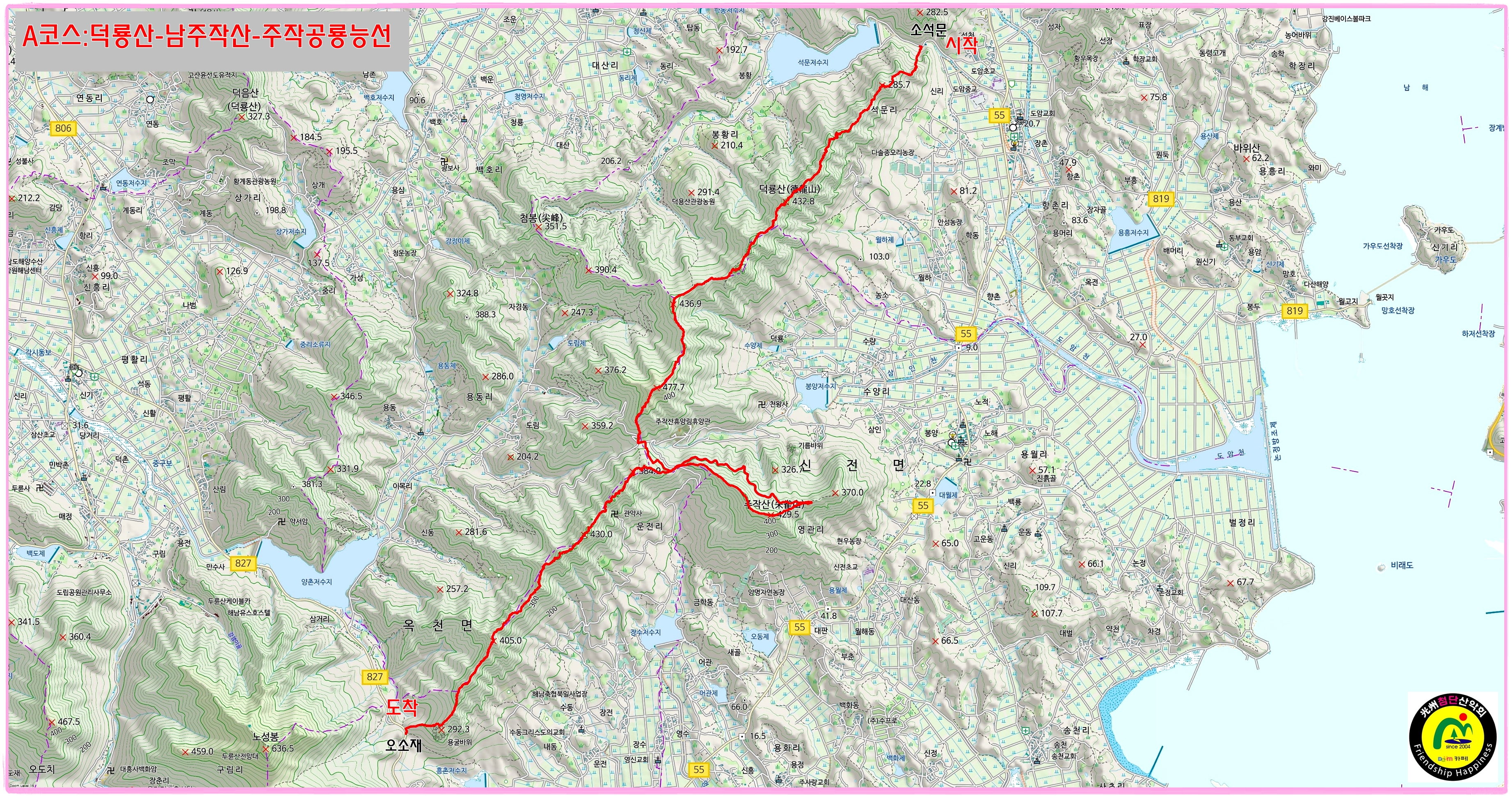 | 산행 코스 | A코스 | 소석문(들머리,20m)→동봉(420m)→서봉(432m)→수양마을갈림길→ 첨봉(437m)→덕룡봉(475m)→작천소령(280m)→진달래군락지→임도→ 활공장→남주작산(428m)→전망대→주작공룡능선→428봉→412봉→ 362봉→오소재(날머리,180m) | |||||
