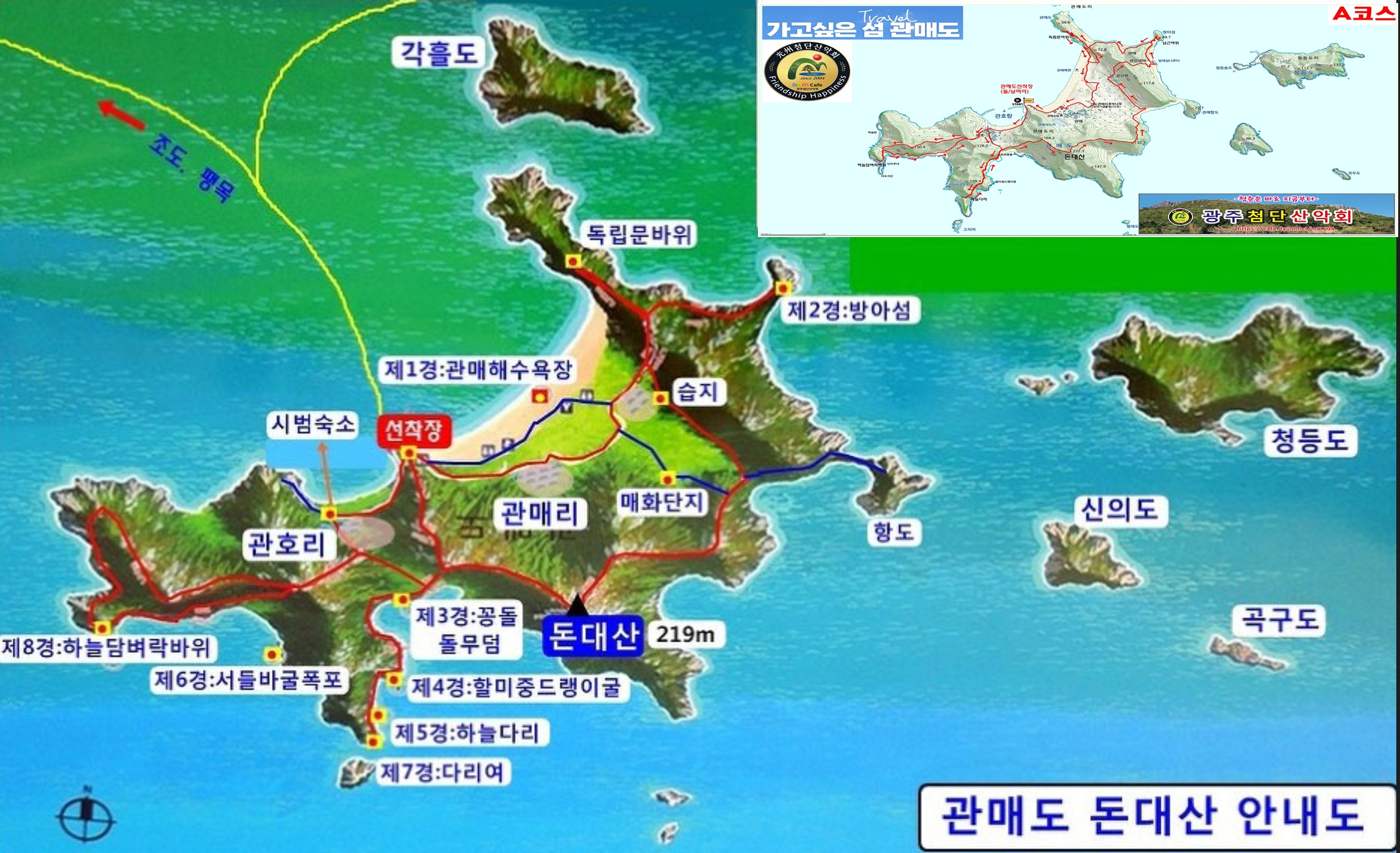 | 산행 코스 | A코스 | 관매선착장(들머리)➔관호마을(돌담길)➔150봉➔벼락바위➔ 마을갈림길➔관호마을➔우실➔돌묘와 꽁돌(3경)➔암봉전망대➔ 하늘다리(5경)➔우실➔돈대산갈림➔돈대산 정상(222m)➔ 관매마을갈림➔샛배➔샛배해변➔정자➔장산편➔장산넘어➔ 방아섬(2경)➔남근바위➔암문해안➔독립문바위➔ 관매도 해수욕장 및 곰솔밭(1경)➔관매습지➔ 관매도 후박나무(천연기념물)➔관매마을➔관매선착장(날머리) | |||||