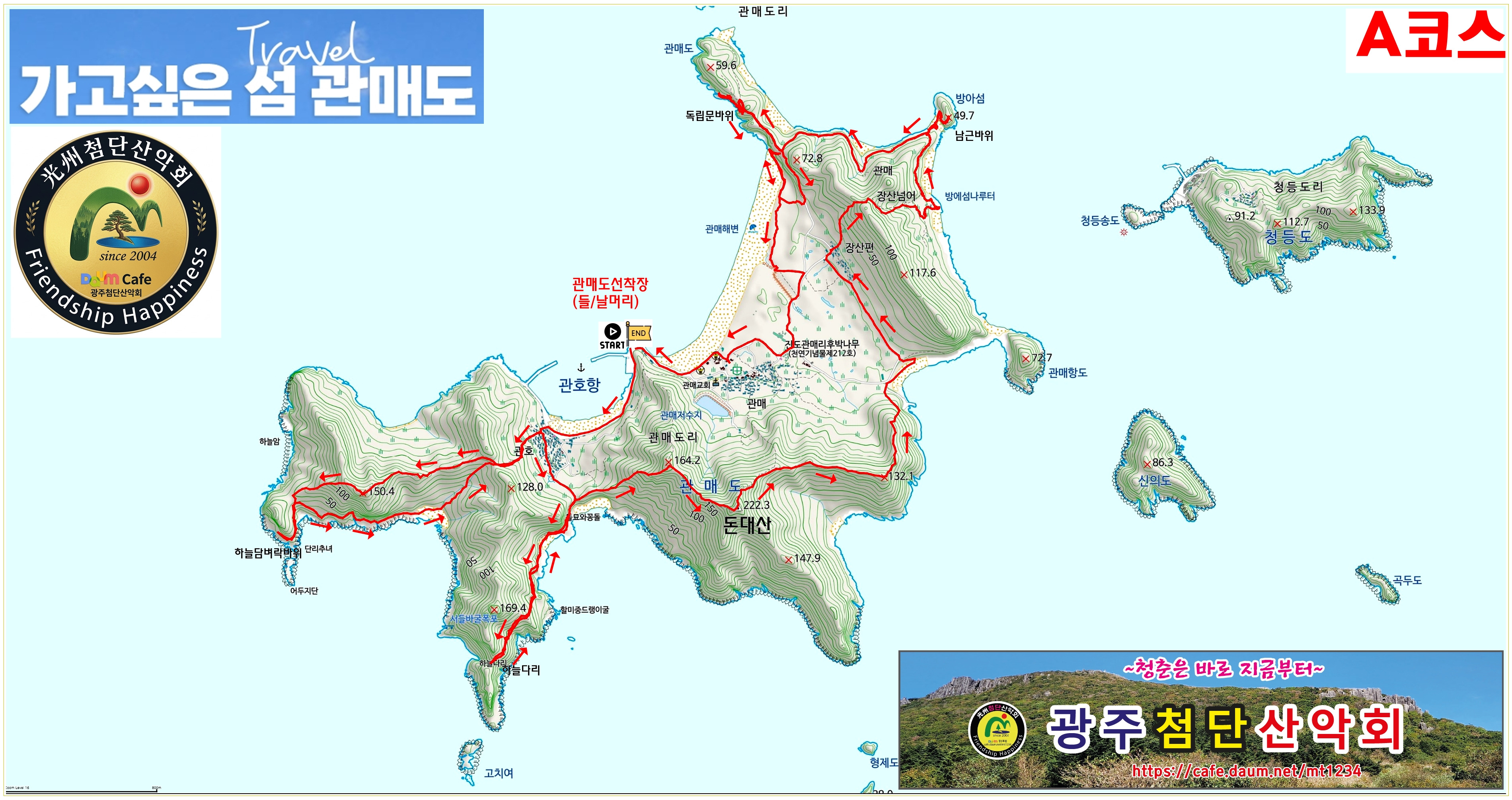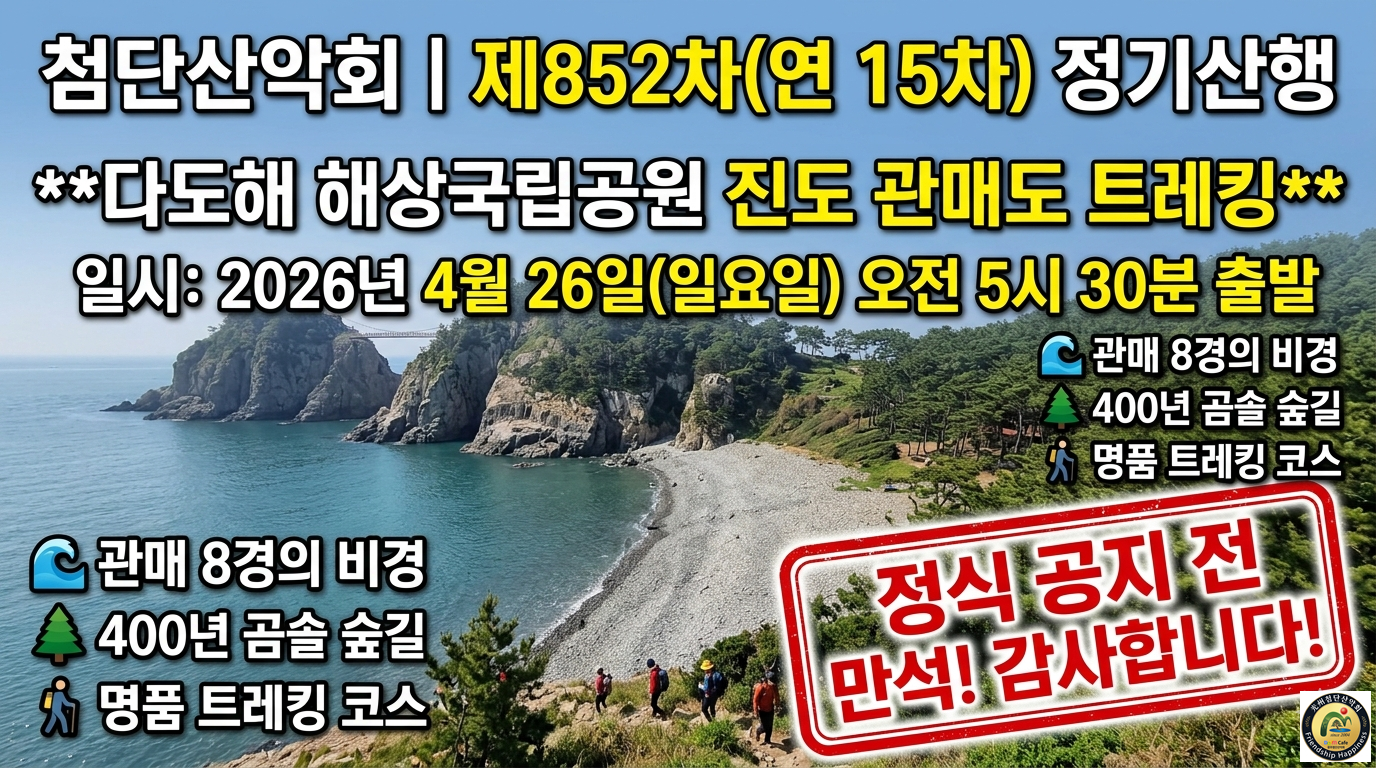 | 첨단산악회 회원 여러분, 안녕하십니까. 오는 2026년 4월 26일(일)에 예정된 제852차(연 15차) 정기산행에 보내주신 뜨거운 성원에 깊은 감사를 드립니다. 놀랍게도 정식 산행 공지를 올리기도 전에 모든 좌석이 만석을 이루었습니다. 우리 첨단산악회 회원님들의 식지 않는 열정과 단합력에 다시 한번 고개 숙여 감사드립니다. 이번 산행지로 다도해 해상국립공원의 '관매도'를 선택한 이유는 분명합니다. 관매도는 단순한 섬이 아니라 발길 닿는 모든 곳이 절경인 다도해의 숨겨진 진주이기 때문입니다. 하늘을 떠받치는 듯한 기암괴석들이 빚어낸 '관매 8경'의 신비로움, 수백 년 세월을 품은 울창한 곰솔(해송) 숲길에서 뿜어져 나오는 짙은 피톤치드, 그리고 에메랄드빛 바다가 어우러진 풍경은 걷는 것 자체로 완벽한 치유의 시간을 선사합니다. 왜 많은 분들이 관매도, 관매도 하는지 이번 트레킹을 통해 그 진면목을 직접 확인하시게 될 것입니다. 설레는 마음을 안고, 4월 26일 일요일 새벽 5시 30분에 밝은 얼굴로 뵙겠습니다. 뜨거운 성원에 다시 한번 감사드립니다. |
