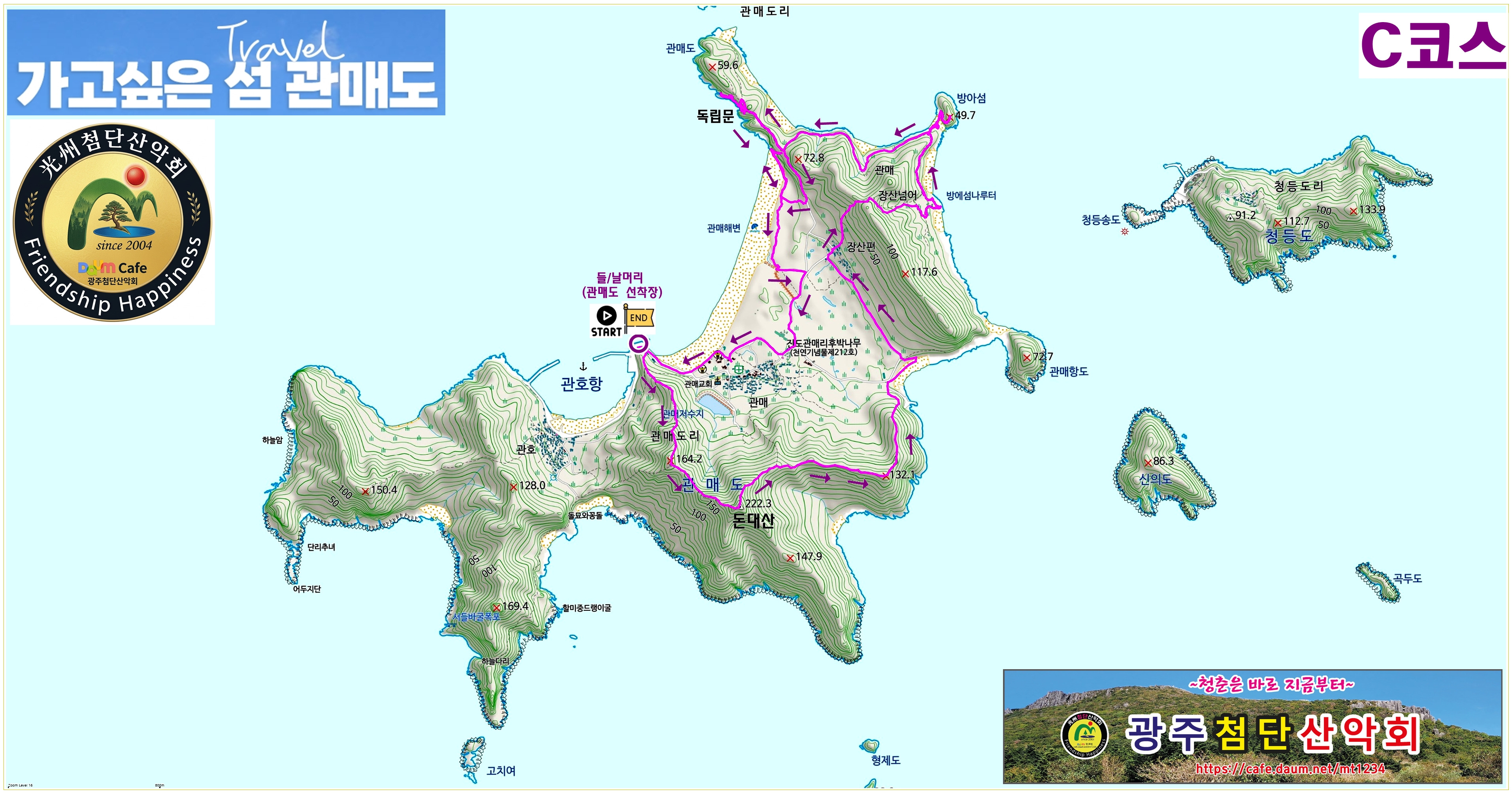 | C코스 | 관매선착장(들머리)➔돈대산갈림➔돈대산 정상(222m)➔ 관매마을갈림➔샛배➔샛배해변➔정자➔장산편➔장산넘어➔ 방아섬(2경)➔남근바위➔암문해안➔독립문바위➔ 관매도 해수욕장 및 곰솔밭(1경)➔관매습지➔ 관매도 후박나무(천연기념물)➔관매마을➔관매선착장(날머리) | ||||||