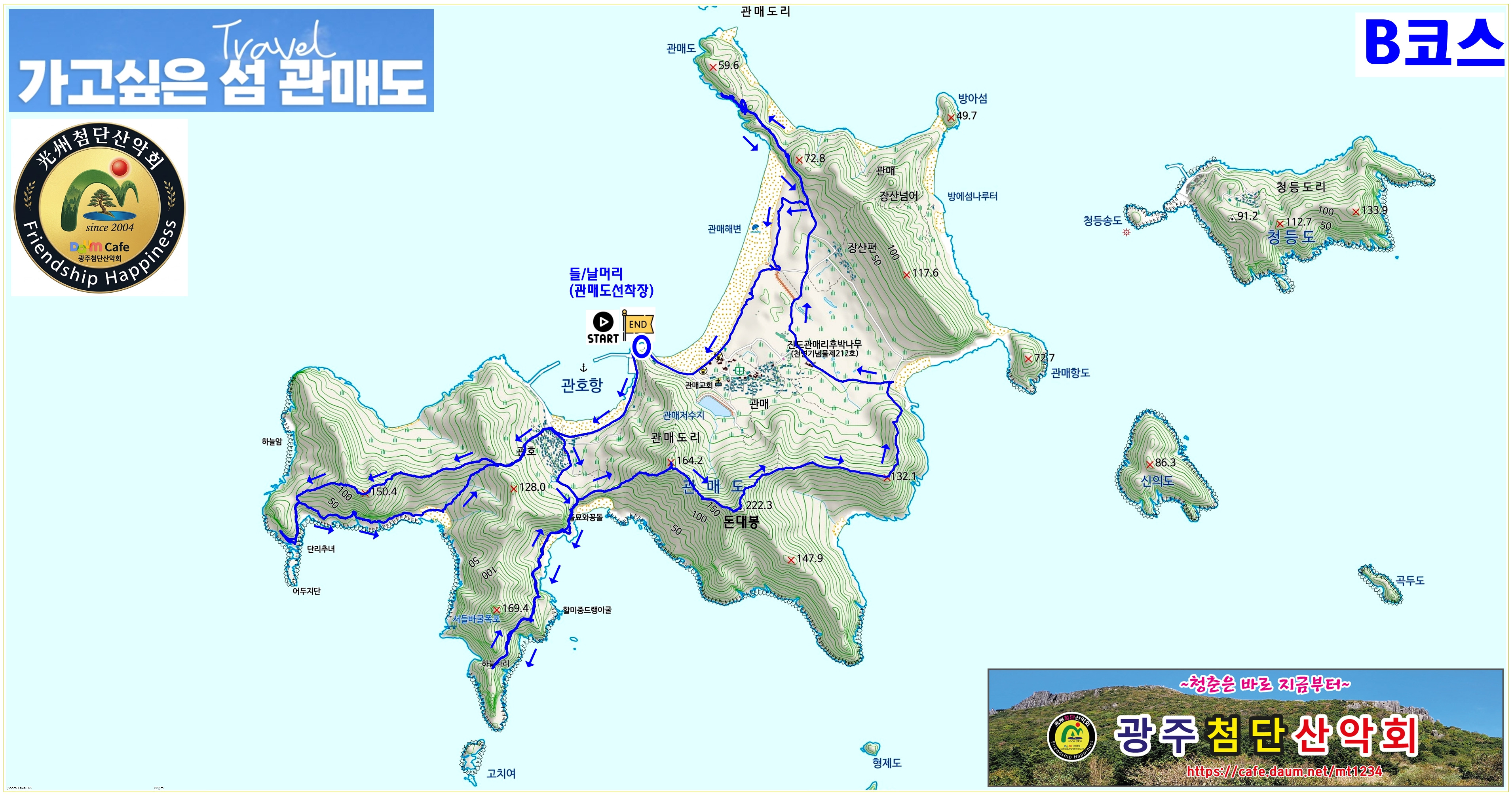 | ▣산행개요 '영혼을 치유하는 자연 보물' 진도 관매도 진도의 숨은 진주, 관매도(觀梅島)는 다도해해상국립공원에 속한 아름다운 섬입니다. 2km에 달하는 고운 모래해변과 수백 년 된 곰솔(해송) 숲, 그리고 기암괴석이 빚어낸 '관매 8경'으로 유명하여 트레킹과 백패킹의 성지로 불립니다. 관매도 마실길은 크게 선착장을 기준으로 우측(하늘다리 방면)과 좌측(방아섬 방면) 코스로 나뉘며, 섬 전체를 일주하며 관매8경 중 1~5경을 감상할 수 있는 총연장 약 8.4km ~ 18km의 걷기 좋은 길입니다. [관매도 18.3km 완벽 종주 코스 구간별 분석] ▣ 1구간: 워밍업 및 서남부 해안 절경 탐방 (관매선착장 ~ 하늘다리) ♣경로: 관매선착장(들머리) → 관호마을(돌담길) → 150봉 → 벼락바위 → 마을갈림길 → 관호마을 → 우실 → 돌묘와 꽁돌(3경) → 암봉전망대 → 하늘다리(5경) ☞특징 분석: 산행 초반부로 고즈넉한 관호마을의 돌담길을 걸으며 가볍게 몸을 푼 뒤 150봉을 오르며 본격적인 산행이 시작됩니다. 벼락바위와 꽁돌, 절벽 위 암봉전망대를 거쳐 아찔한 하늘다리까지 이어지는 구간은 관매도의 해안 기암괴석이 집중된 곳입니다. ☞주의 사항: 초반부터 풍광이 뛰어나 회원님들의 사진 촬영이 많아질 수 있는 구간입니다. 절벽 지대가 있으므로 안전사고에 각별히 유의하시어 진행하셔야 됩니다. ▣2구간: 고도 상승 및 주봉 등반 (하늘다리 ~ 돈대산 정상) ♣경로: 하늘다리 → 우실 → 돈대산갈림 → 돈대산 정상(222m) → 관매마을갈림 ☞특징 분석: 해안가에서 섬의 최고봉인 돈대산(222m)으로 고도를 높이는 구간입니다. 절대적인 해발고도는 낮지만, 해수면(0m)에서 시작해 오르는 섬 산행의 특성상 제법 가파른 오르막을 경험하게 됩니다. 정상에 서면 조도군도 일대의 섬들이 한눈에 들어오는 탁 트인 다도해 조망이 일품입니다. ☞포인트: 이번 산행에서 가장 땀을 많이 흘리는 오르막 구간입니다. 회원님들의 호흡이 트일 수 있도록 페이스를 늦추고, 정상에서 조망을 즐기며 꿀맛 같은 휴식을 취하시면 좋습니다. ▣3구간: 동북부 해안 트레킹 및 기암 탐험 (돈대산 하산 ~ 독립문바위) ♣경로: 샛배 → 샛배해변 → 정자 → 장산편 → 장산넘어 → 방아섬(2경) → 남근바위 → 암문해안 → 독립문바위 ☞특징 분석: 산에서 내려와 섬의 동북쪽 해안선을 따라 길게 걷는 트레킹 코스입니다. 방아섬, 남근바위, 독립문바위 등 독특한 해안 지형을 차례로 만납니다. 해안가 특유의 작은 오르내림(업다운)이 반복되는 구간입니다. ☞포인트: 산행 중후반부에 접어들어 10km 이상 걸은 상태이므로 회원님들의 피로도가 누적되기 시작하는 지점입니다. 바닷바람을 맞으며 걷기 좋으나, 체력이 떨어지면 과감히 코스를 단축 해 주십시오. ▣4구간: 힐링 트레킹 및 원점회귀 마무리 (해수욕장 ~ 관매선착장) ♣경로: 관매도 해수욕장 및 곰솔밭(1경) → 관매습지 → 관매도 후박나무(천연기념물) → 관매마을 → 관매선착장(날머리) ☞특징 분석: 거친 갯바위와 산길을 벗어나 부드러운 모래사장과 푹신한 소나무 숲길을 걷는 완벽한 쿨다운(Cool-down) 구간입니다. 천연기념물인 후박나무를 감상하며 관매마을을 통과해 다시 선착장으로 돌아옵니다. ☞포인트: 울창한 곰솔밭의 피톤치드를 마시며 산행의 피로를 풀 수 있도록 여유를 주시면 좋습니다. 단, 배 출항 시간에 늦지 않도록 마지막까지 선두와 후미의 간격을 유지하며 선착장에 무사히 도착하는 것이 핵심입니다. ♣종합 조언♣ 산행 거리가 18.3km이고 예상 시간이 7시간 30분에 달하는 긴 코스입니다. 4월 말의 따뜻한 봄 날씨를 고려할 때 해안선 구간에서는 그늘이 부족할 수 있으므로 식수(최소 1.5리터)와 행동식, 그리고 자외선 차단 대책을 세우시면 좋겠습니다. |