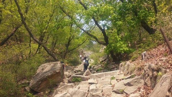 - 숨을 몰아치며 오르고 비둘기길 앞에 오니 딱 한 팀 그것도 네 명이 하고 있다.