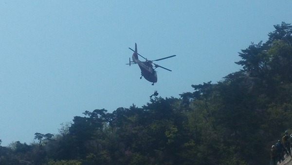 - 잠수함바위 윗쪽으로 사고가 났는지 헬기가 떠서 사람을 내리고 올리고 있다.