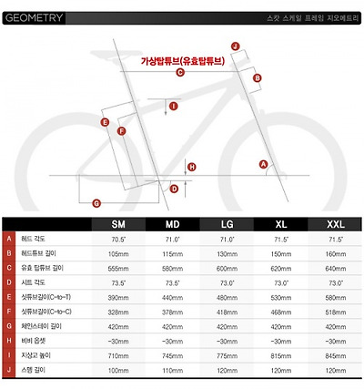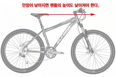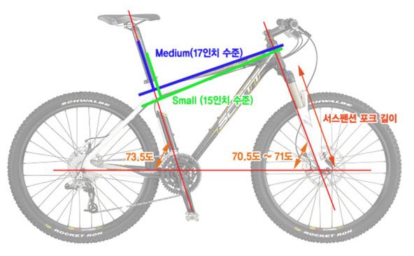 일반적인 자전거 사이즈를 보기 위해 크로스컨트리용 산악자전거 스캇(Scott) 스케일의 지오메트리 표를 확인해 보자. 우리나라에서 가장 많이 판매되는 스몰(SM)과 미디엄(MD) 사이즈를 비교하면 다음과 같다. 1. 시트튜브의 길이 차이 : 50mm 2. 유효 탑튜브의 길이 차이 : 25mm 3. 헤드튜브의 길이 차이 : 10mm 4. 헤드튜브의 각도 : 0.5도 (스몰 : 70.5도, 미디엄 : 71도) 시트튜브의 길이는 프레임 사이즈로 보면 50mm(2인치 정도) 차이가 나지만, 실제 가상 탑튜브의 길이는 25mm 차이를 보인다. 그러면서도 휠베이스(앞뒤 바퀴의 사이) 길이를 유지하기 위해 헤드튜브의 각도가 0.5도 작게 설계했다. 키가 작은 사람의 경우 작은 프레임으로 탑튜브의 길이를 어느정도 해결할 수 있지만, 여기서 한가지 문제가 생긴다. 안장은 시트튜브에 따라 많이 낮출 수 있지만, 핸들바의 높이는 여전히 10~20mm정도 밖에 낮추어 지지 않았다는 것이다.