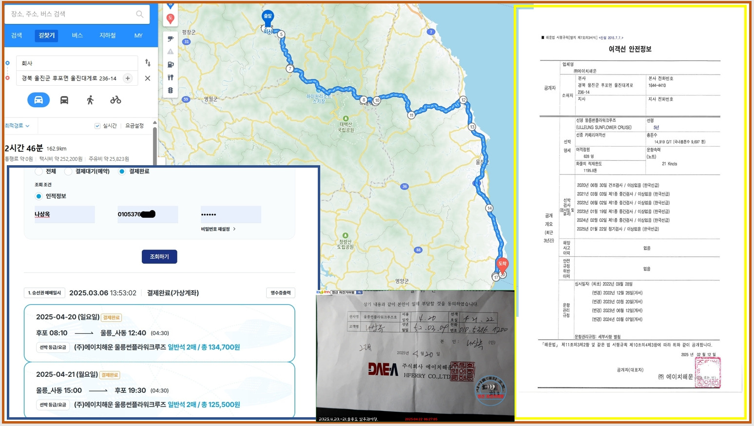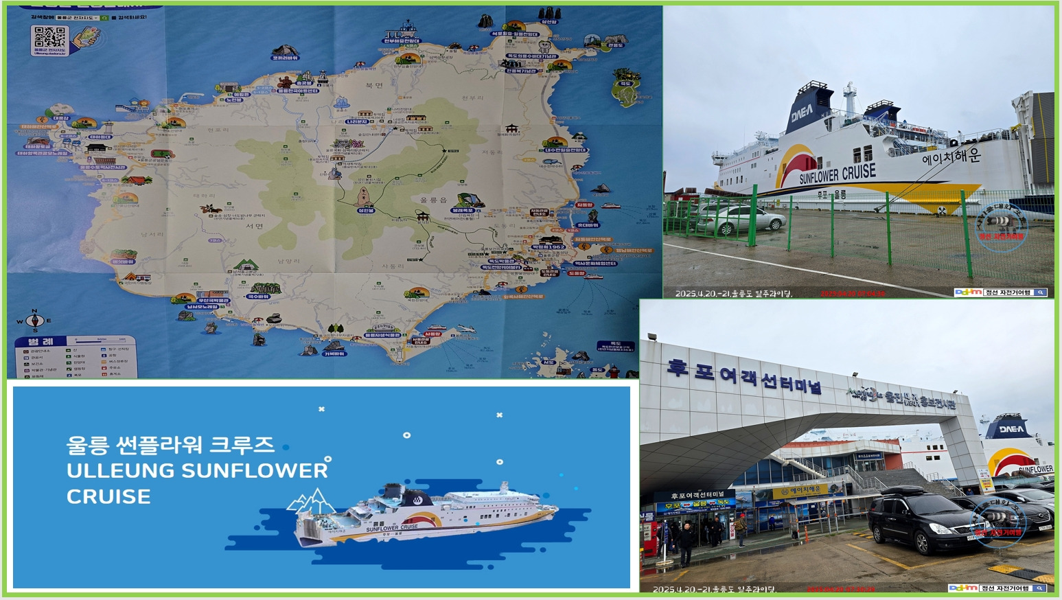 정선에서 후포항 여객터미널까지는 3시간이소요되고 자차로 이동했으며 후포항- 울릉도 사동항을 운행하는 선플라워크루즈호를 예약했다.