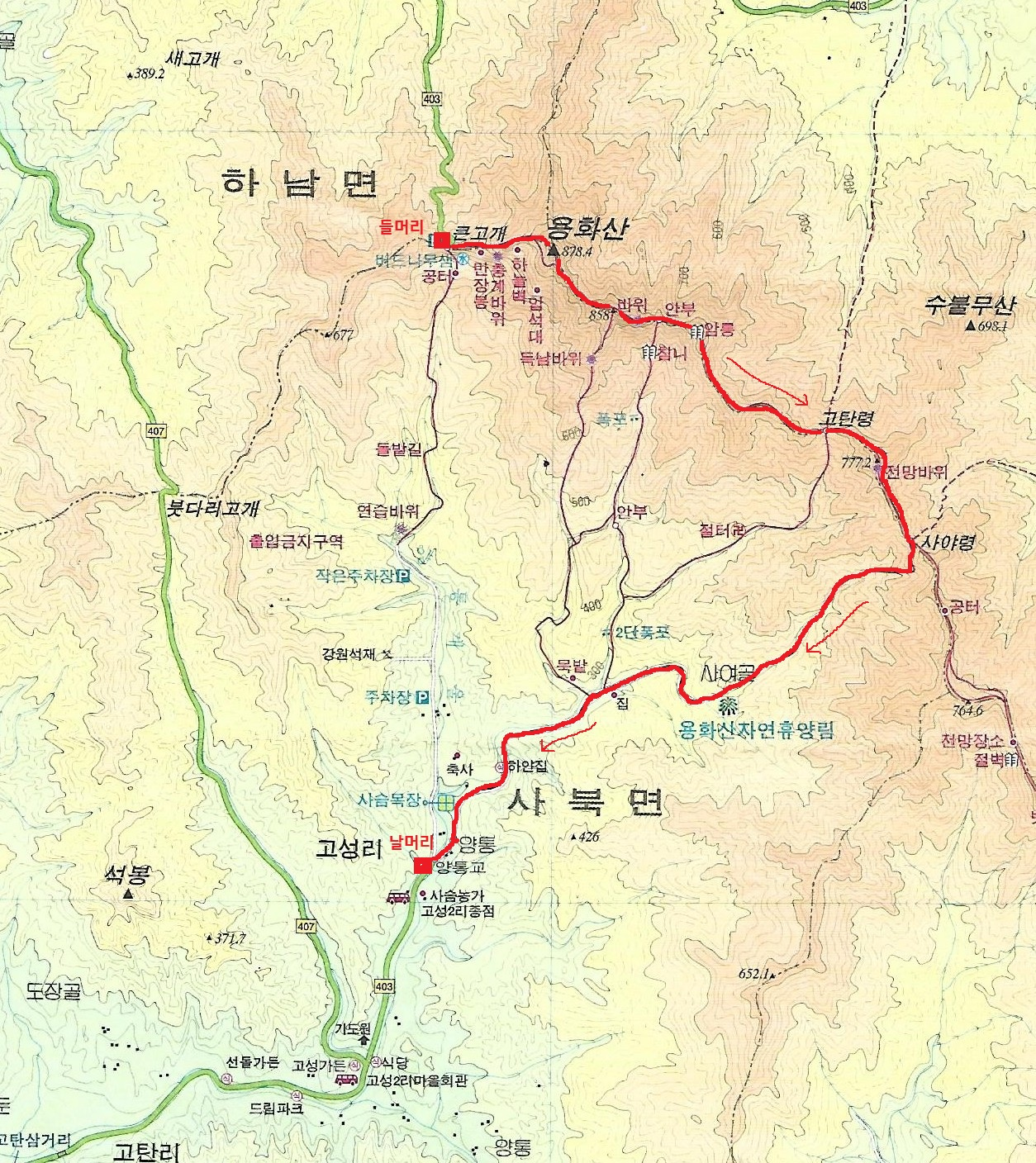 | 코 스 | 큰고개 주차장 - 용화산 - 안부 - 고탄령 - 사야령 - 용화산 자연휴양림. |