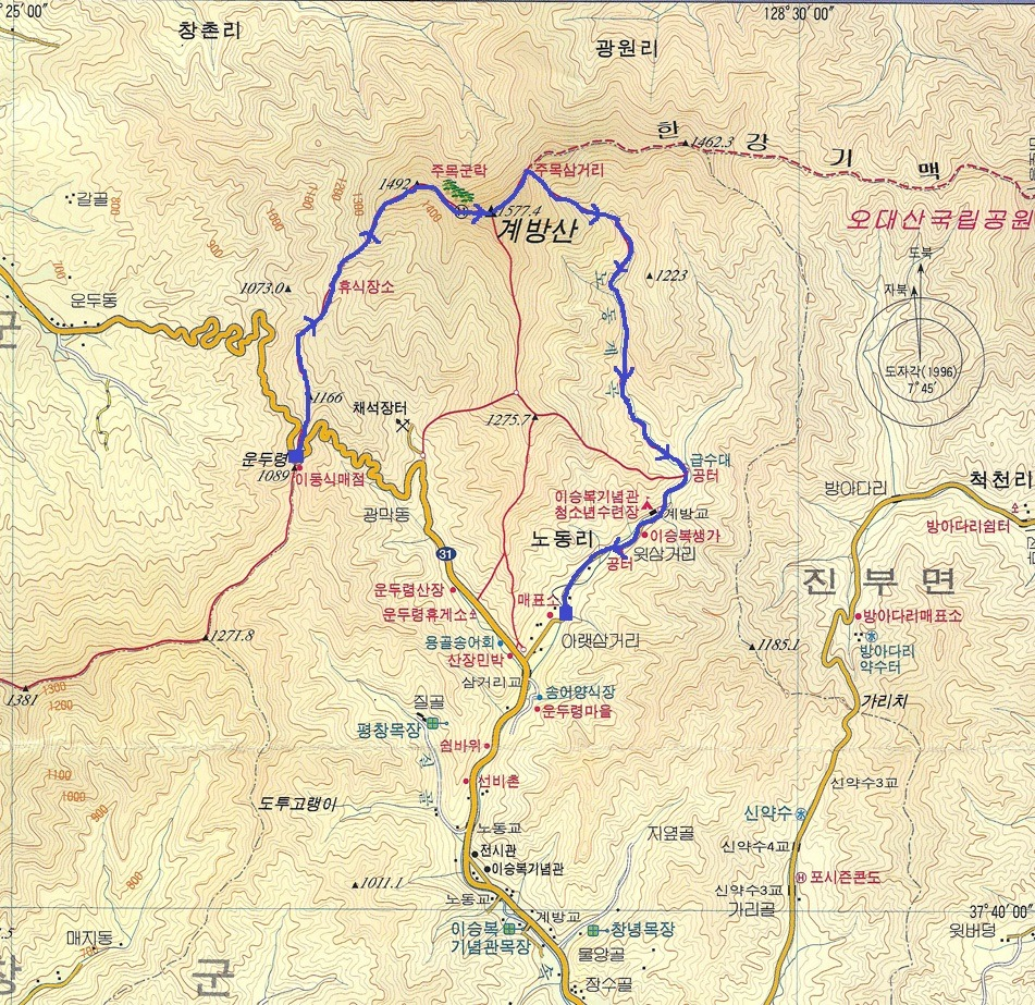 ■ 산행 코스. 거리 및 소요 예상시간. 산행 지도. * 산행코스 : 운두령 - 전망대 - 계방산정상 - 주목삼거리 - 노동계곡 - 이승복생가 - 매표소 주차장. * 거리 및 소요 예상시간 : 약 11km, 약 5시간. * 산행지도. |