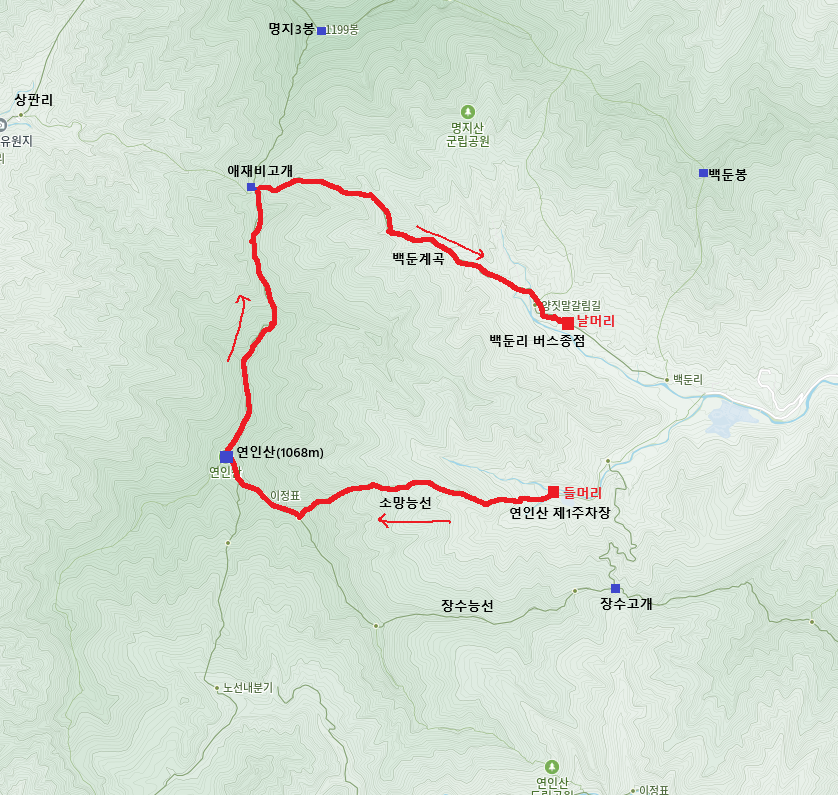 | 코 스 | 연인산 제1주차장(백둔리) - 소망능선 - 연인산정상 - 북릉 - 아재비고개 - 백둔리계곡 - 백둔리 버스종점. |