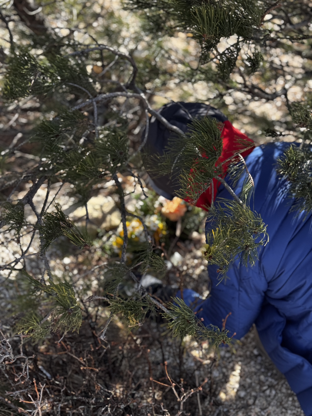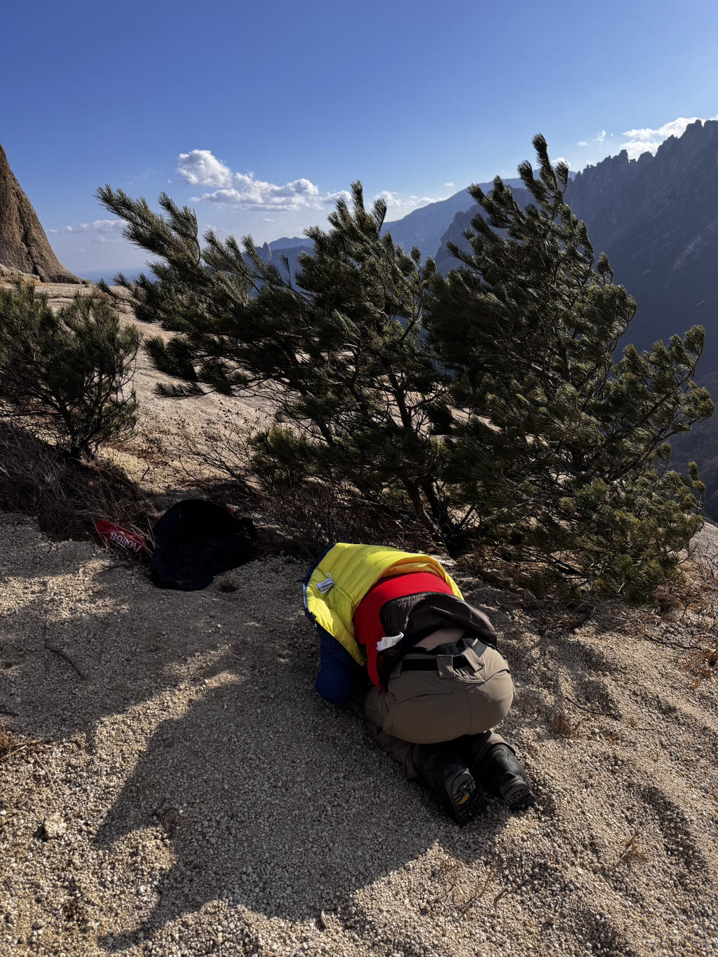 애초 계획은 상봉까지 가는 것이었으나 새벽 5시 눈발과 함께 굉음을 내는 바람소리에 올라가지 못했습니다. 날이 한참 밝은 후에야 올라서 비로소 성인대 소나무에 도착할 수 있었는데요. 강한 바람 때문에 일분도 서있기 어려웠습니다. 따라놓은 소주잔도 엎어지고, 배낭도 날아갈뻔 하고, 다이나믹 했습니다.
