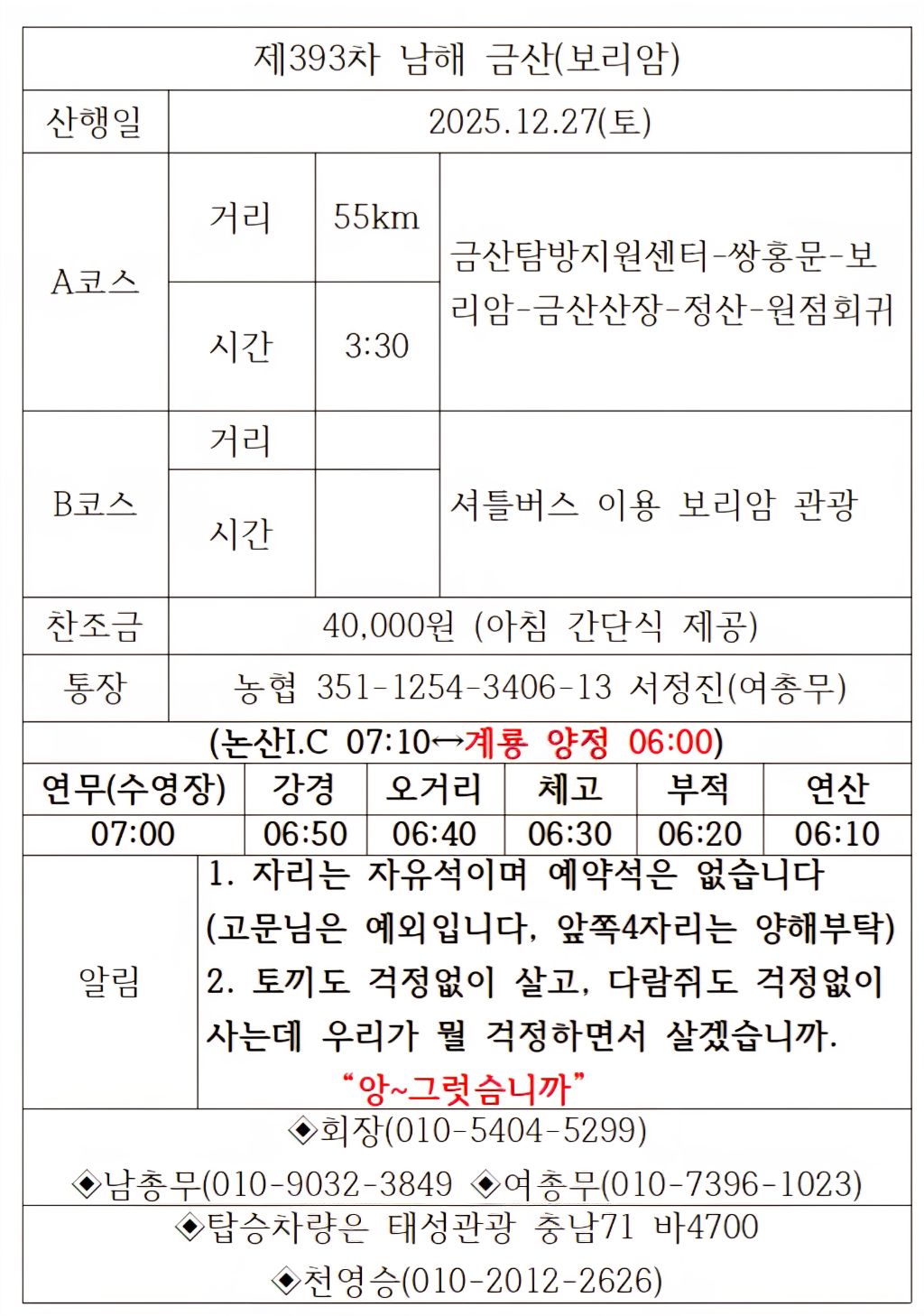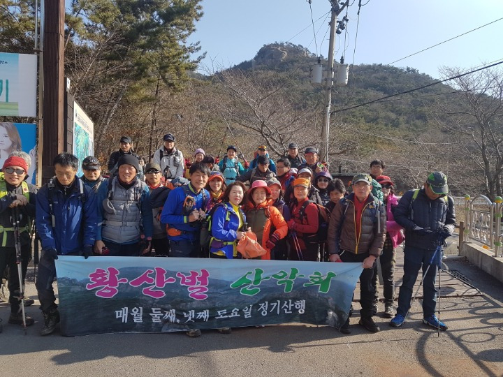 황산벌산악회는 순수 산악동호회로써 산행, 트래킹, 야유회, 래프팅, 번개로 기획된 다양한 행사 등 제반 행사에서 발생할 수 있는 모든 안전사고에 대하여 임원을 포함한 그 누구도 법적 책임이 없음을 알립니다. 상기된 모든 행사에서 발생하는 안전사고는 전적으로 본인의 책임임을 인지하시고 사전 준비운동, 비등타지 않기, 위험한 행동 하지 않기, 개인(산행)보험 가입 등 산행 안전에 만전을 기해 주시기 바라며 산행 신청과 동시에 본 내용에 동의한 것으로 간주하겠습니다.
