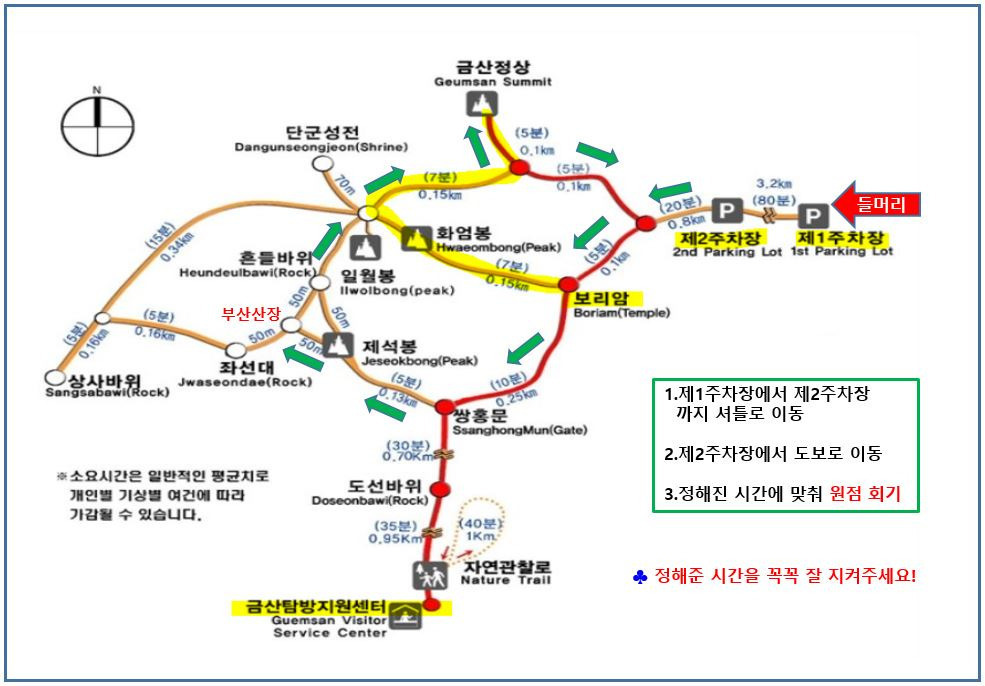 - 겨울철에는 일조 시간이 짧아 오후 산행이 위험할 수 있습니다. 따라서 오전 일찍 출발하여 낮시간에 산행을 마무리 하는 것이 안전하며 산행 중간중간 체력을 체크하며 무리하지 않는 것이 중요합니다.