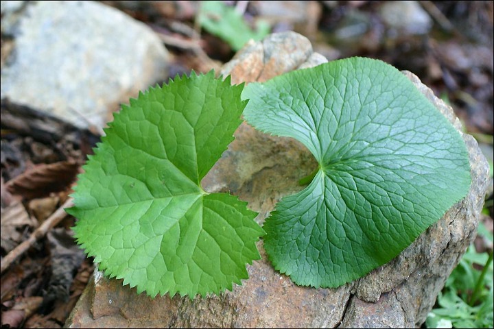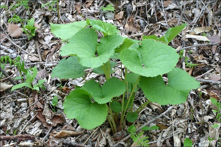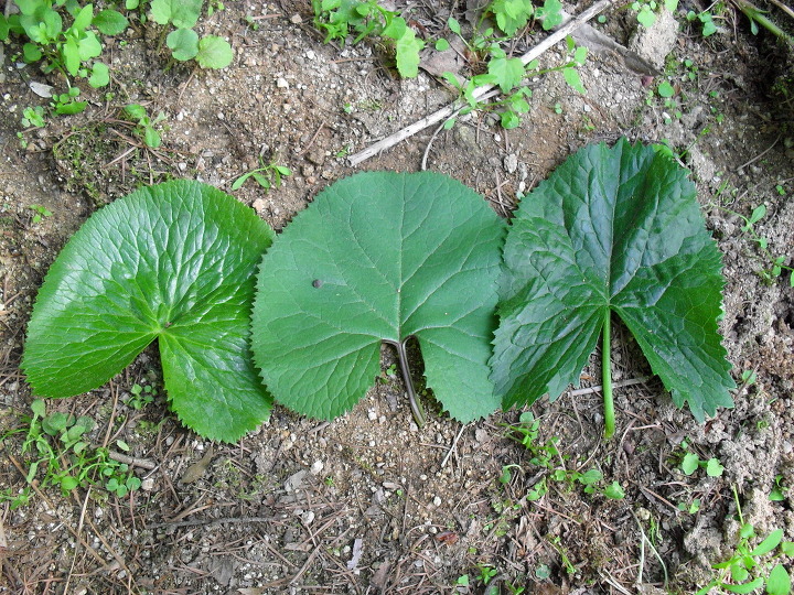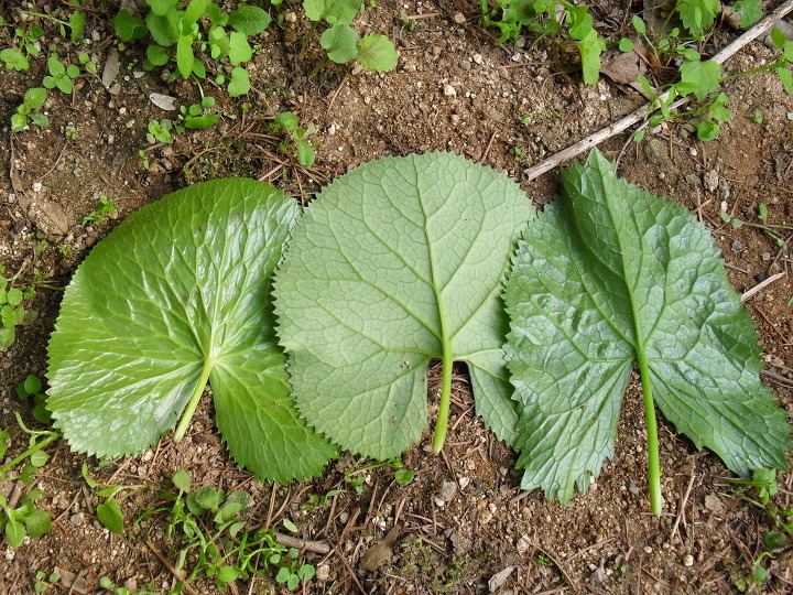 잎뒷면은 동의나물이 가장 매끄럽게 빛나고 곰취는 미세한 털이 나서 매끄럽지않다.
