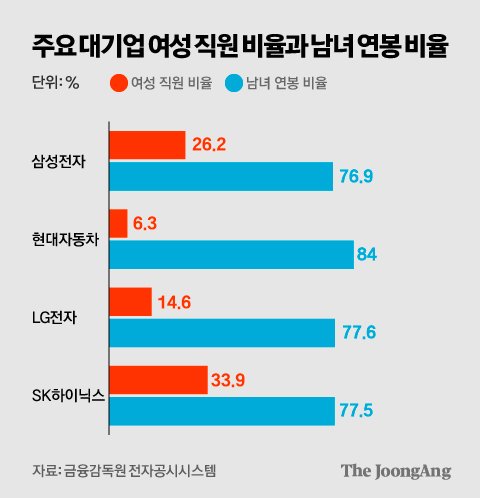 다른 기업과 비교하면 어떨까. 제도적 수준과 실효성은 높다고 평가받지만 삼성은 타 대기업과 비교했을 때 수치상 1위는 아니다. 삼성전자의 지난해 말 기준 여성 직원 비율은 26.2%로 현대차(6.3%)나 LG전자(14.6%)보다 높고, SK하이닉스(33.9%)보다 낮다. 남성 연봉 대비 여성 연봉 비율은 76.9%로 현대차(84%), LG전자(77.6%), SK하이닉스(77.5%) 등 다른 대기업보다 낮은 편이다. 또한 삼성전자의 2021년 기준 여성 임원 비율은 6.5%로 과거(2011년 1.5%)보다 늘었지만 절대적인 수치는 여전히 낮다.