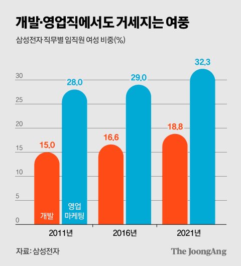 삼성전자에서는 모바일·반도체부문 등에서 이미 여풍이 거세게 불고 있다. 개발 부서에서는 5명 중 1명, 영업마케팅에서는 3명 중 1명이 여성이다. 가전 사업부는 오히려 여성 인력이 더 많다. 수리를 담당하는 삼성전자서비스에서는 기존에 거의 없었던 여성 대형가전(세탁기·에어컨 등) 출장 수리 기사를 늘리고 있다.