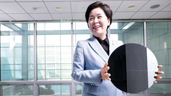 양향자 무소속 국회의원이 서울 여의도 국회의사당 의원회관에서 반도체 기판인 웨이퍼를 들고 있다. 최영재 기자