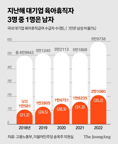 삼성전자 DS부문의 한 직원은 “육아휴직을 사용하는 남성 직원은 10명 중 2명 안팎”이라며 “쓰지 말라고 얘기하는 사람은 아무도 없지만 육아휴직을 쓰겠다고 말하면 주변에서 ‘대단하다’ 또는 ‘용기 있다’는 반응이 나올 만큼 아직도 흔한 일은 아니다”고 말했다.