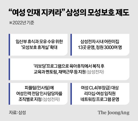 삼성전자 MX(모바일경험)부문 여성 직원 A씨(40대 초반)의 말이다. “신입사원 때만 해도 임신한 직원을 야근하게 해서 문제가 됐다는 얘기를 듣곤 했습니다. 사무직뿐이 아니에요. 공장에 실습을 갔는데 만삭인 직원이 밤에 3교대 근무하는 걸 보고 충격을 받았어요. 요즘은 모성 보호가 철저하게 이뤄지고, 산전 검사를 위한 휴가나 육아 휴직도 다들 잘 챙겨 쓰는 것 같아요.”