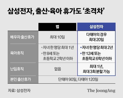 육아휴직 역시 만 8세 또는 초등학교 2학년 이하 자녀 한 명당 최장 1년까지 법으로 보장하지만 삼성전자에서는 만 12세 또는 초등학교 6학년 이하 자녀 한 명당 최장 2년까지 휴직할 수 있다. 법으로 의무화하지 않은 난임 휴직도 최대 1년까지 세 번에 나눠 쓸 수 있다. 이런 제도는 사무직·생산직 모두에 동일하게 적용된다.