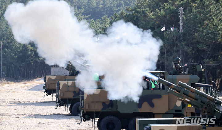 이무열 기자 = 육군 제2작전사 예하 950포병대대가 23일 경북 포항시 북구 송라면 화진훈련장에서 후반기 해상 포병 사격 훈련을 실시하고 있다.