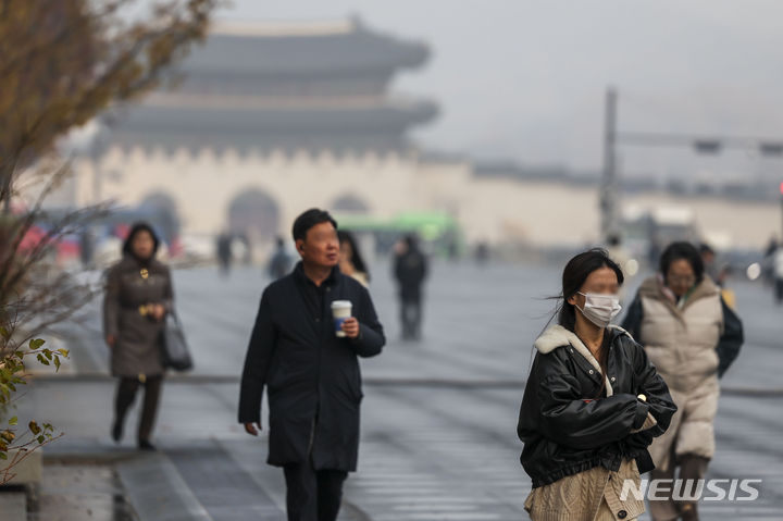 정병혁 기자 = 수도권과 중부지방을 중심으로 미세먼지 농도가 '나쁨' 수준을 보인 23일 서울 종로구 광화문광장에서 마스크를 쓴 시민들이 이동하고 있다.