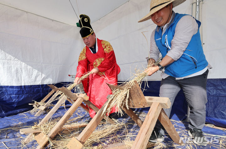 강종민 기자 = 23일 세종시 싱싱장터 도담점에서 열린 밥맛 좋은쌀 선정 경진대회에서 세종대왕 복장과 밀짚모자를 쓴 행사 관계자들이 재래식 탈곡 작업을 시연하고 있다.