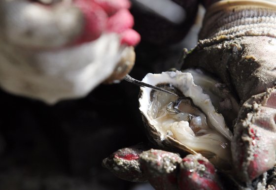 그런데도 11월부터 굴을 수확하는 건, 김장 때문이다. 김장은 1년 중에 굴을 압도적으로 많이 소비하는 전국 단위의 이벤트다. 김장철이 지나야 정점까지 치달았던 굴 값이 정신을 차린다. 크리스마스는 부산에서 김장이 끝나는 때다. 부산에서 김장이 끝나면 굴 값이 1㎏에 1000원씩 내려간다. 이제 얼마 안 남았다.