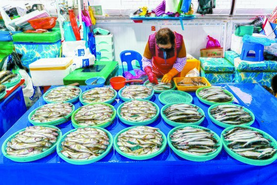 주문진 수산시장에서 도루묵과 양미리를 파는 할머니. 왼쪽이 도루묵이고 오른쪽이 양미리다. 백종현 기자