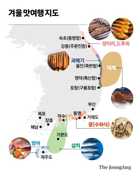 오늘 강의에서 함께 공부할 겨울 바닷것을 열거한다. 굴, 양미리, 도루묵, 방어, 삼치, 과메기, 대게. 하나같이 겨울 여행의 목적으로 충분한 제철 먹거리로, 여행기자는 이것들 챙겨 먹고 다니느라 겨울마다 바빴다. 물론, 이것들 말고 더 있다.