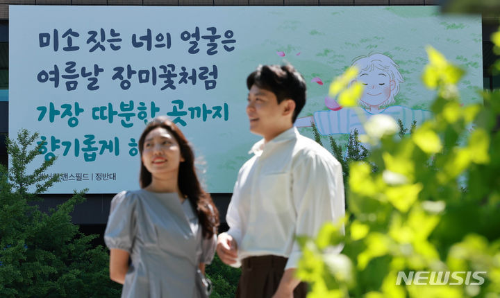 고범준 기자 = 3일 오전 서울 종로구 세종대로 교보빌딩 외벽에 여름을 맞아 새롭게 단장한 '미소 짓는 너의 얼굴은 여름날 장미꽃처럼 가장 따분한 곳까지 향기롭게 해'라는 문구가 게시되어 있다. 이번 문안은 작은 미소가 세상을 밝게 한다는 의미를 담았다