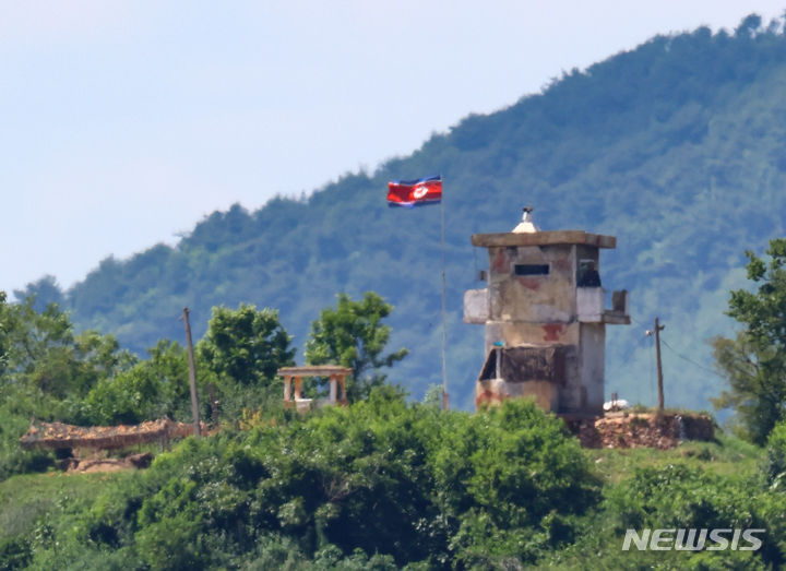 황준선 기자 = 3일 경기 파주시 자유로에서 바라본 북한 초소에서 북한군이 근무를 서고 있다.