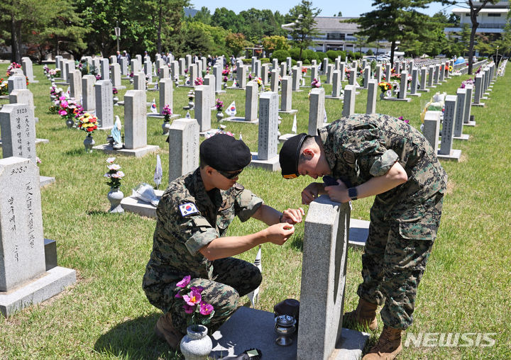 김금보 기자 = 3일 오전 서울 동작구 국립서울현충원에서 육군특수전사령부 국제평화지원단 장병들이 호국보훈의 달을 맞아 먼저 가신 선배의 묘역을 정비 하고 있다.