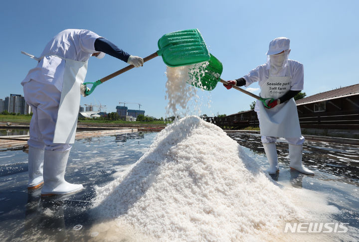 전진환 기자 = 맑은 날씨를 보인 3일 인천 중구 영종도 씨사이드파크 염전에서 염부들이 소금을 모으고 있다.