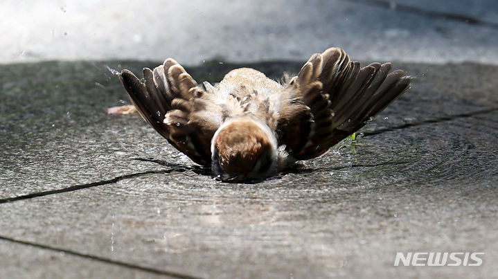 홍효식 기자 = 서울 낮 최고기온이 28도로 더운 날씨를 보인 3일 서울 종로구 광화문광장 분수대 인근에서 참새가 더위를 식히고 있다.