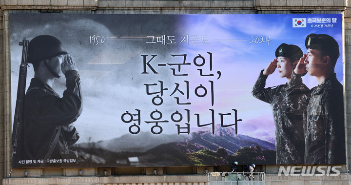 이영환 기자 = 3일 오전 서울 중구 서울도서관 외벽 서울꿈새김판이 호국보훈의 달을 맞아 'K-군인, 당신이 영웅입니다' 문구로 새 단장되고 있다.