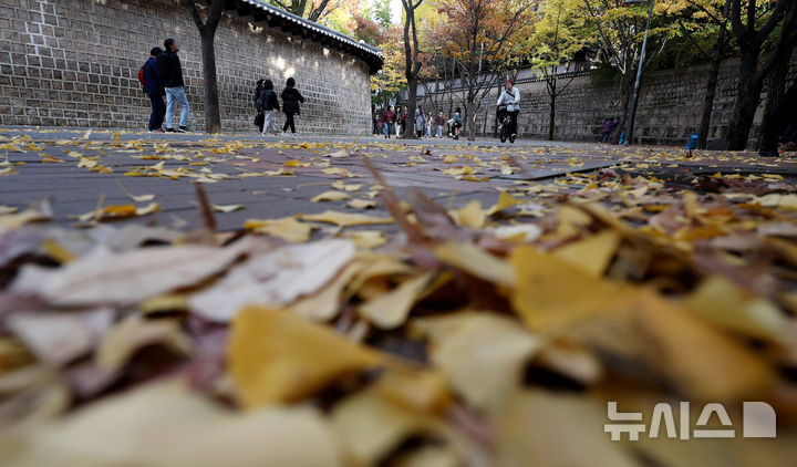 추상철 기자 = 기온이 뚝 떨어지며 쌀쌀한 날씨를 보인 5일 오후 서울 중구 덕수궁 돌담길에서 시민들이 낙엽을 밟으며 가을 정취를 만끽하고 있다.