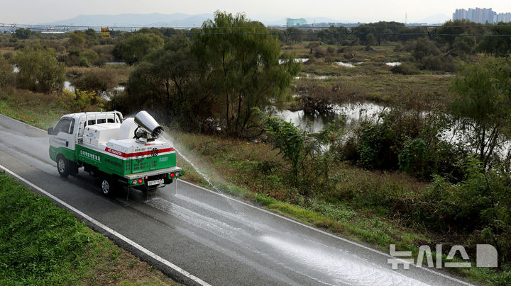 이무열 기자 = 5일 대구 동구 금호강 안심습지에서 대구시 보건환경연구원 동물방역과 관계자들이 조류인플루엔자(AI)를 예방하기 위해 방역차량을 이용해 소독작업을 하고 있다.