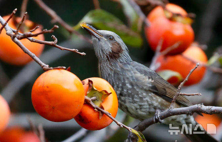 우장호 기자 = 쌀쌀한 날씨를 보이는 5일 오전 제주시 연동의 한 주택가 감나무에서 직박구리가 먹이활동을 하고 있다.