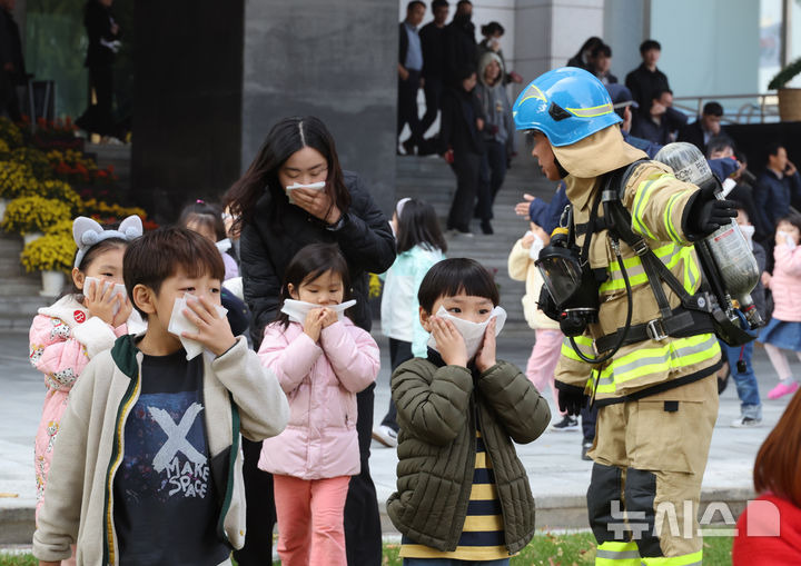 입 막고 화재 대피 훈련