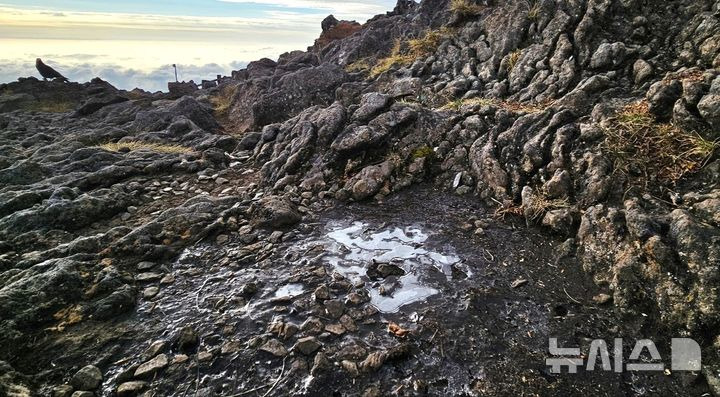 5일 오전 한라산 백록담 정상 부근 해발 1900m에서 첫 얼음이 관측됐다. 이끼가 낀 암반에서는 고드름이 달리기도 했다. (사진=독자 제공)