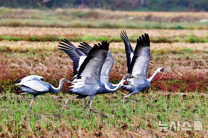 차용현 기자 = 5일 오전 경남 사천시 광포만 인근 농경지에서 천연기념물 제203호 재두루미들이 먹이활동을 하고 있다.