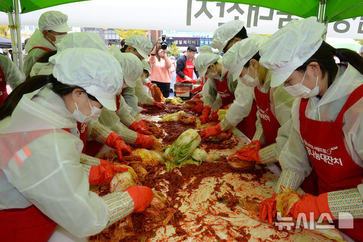 배병수 기자 = 5일 오전 울산 남구 롯데백화점 광장에서 열린 '신격호 롯데 사랑드림 김장나눔'행사에서 롯데그룹 계열사 임직원들이 지역의 소외계층에 전달할 김장김치를 양념에 버무리고 있다.