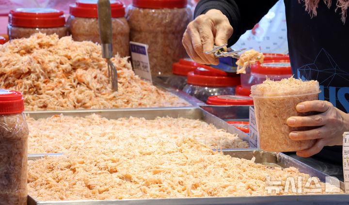 전진환 기자 = 본격적인 김장철을 앞둔 5일 오후 인천 남동구 소래포구 전통어시장에서 상인이 새우젓을 통에 담고 있다.