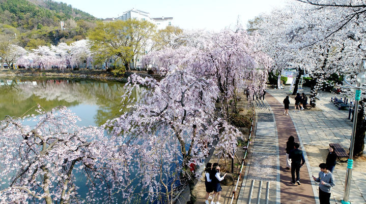 따뜻한 봄 날씨를 보인 2일 경남 창녕군 영산 연지못의 벚꽃이 활짝 피어 봄의 정취를 더하고 있다. 이번 주말까지 벚꽃의 향연을 볼 수 있을 것으로 보인다. (사진= 창녕군 제공)