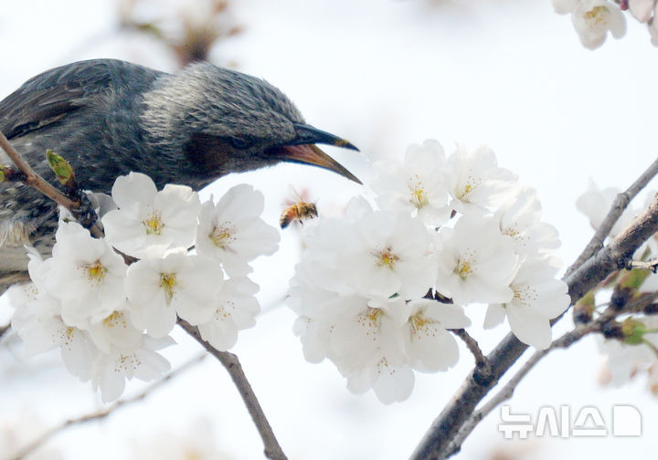 김얼 기자 = 완연한 봄 날씨가 연일 이어지고 있는 3일 전북 전주시 가리내로에서 직박구리가 만개한 벚꽃의 꿀을 빨고 있다.