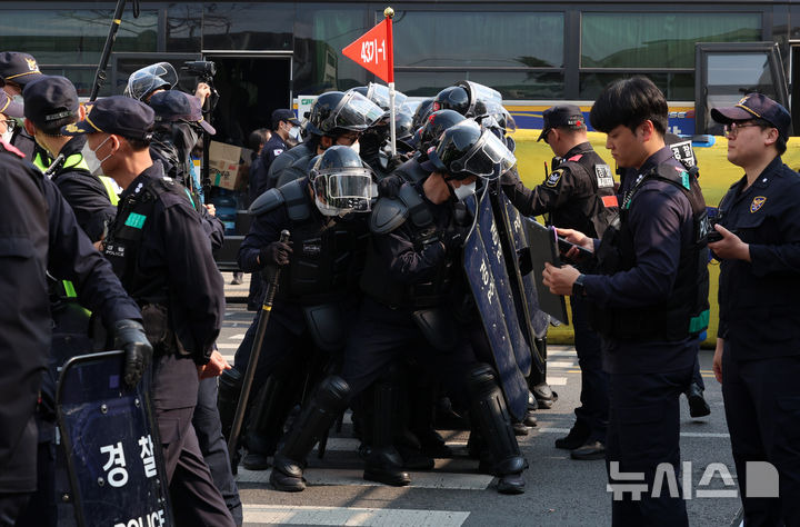 이영환 기자 = 윤석열 대통령 탄핵 심판 선고를 하루 앞두고 서울에 을호비상이 발령된 3일 오후 서울 종로구 안국역 인근에서 경찰 기동대가 훈련을 하고 있다.