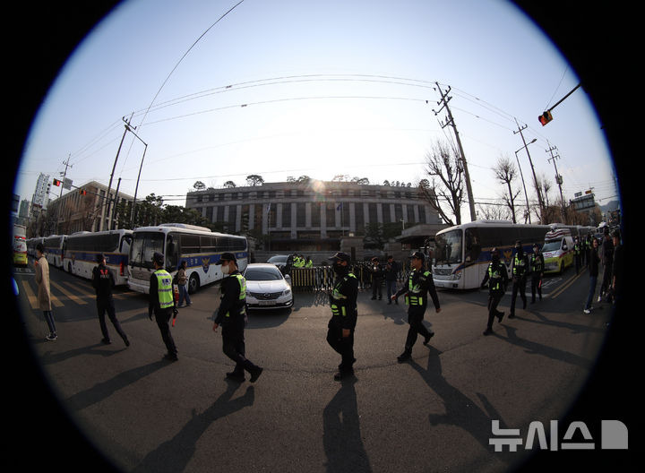 김명년 기자 = 윤석열 대통령 탄핵 심판 선고를 하루 앞둔 3일 오후 서울 종로구 헌법재판소 앞에서 경찰이 이동하고 있다.