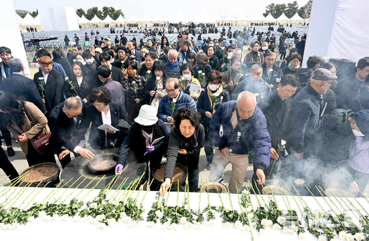 우장호 기자 = 제77주년 제주4·3 추념일인 3일 오전 제주시 봉개동 제주4·3평화공원에서 시민들이 희생영령을 위해 헌화 분향하고 있다. (제주도사진기자회)