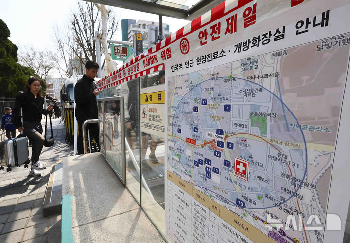 김근수 기자 = 윤석열 대통령에 대한 탄핵심판 선고를 하루 앞둔 3일 오후 서울 종로구 안국역 인근에 의료 현장진료소와 개방 화장실 안내문이 붙어 있다.